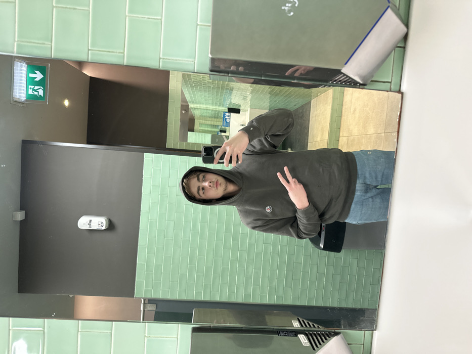 - "A young man in a gray hooded sweatshirt and jeans takes a mirror selfie in a public restroom" by FM-5WnvD2, licensed under CC BY 4.0