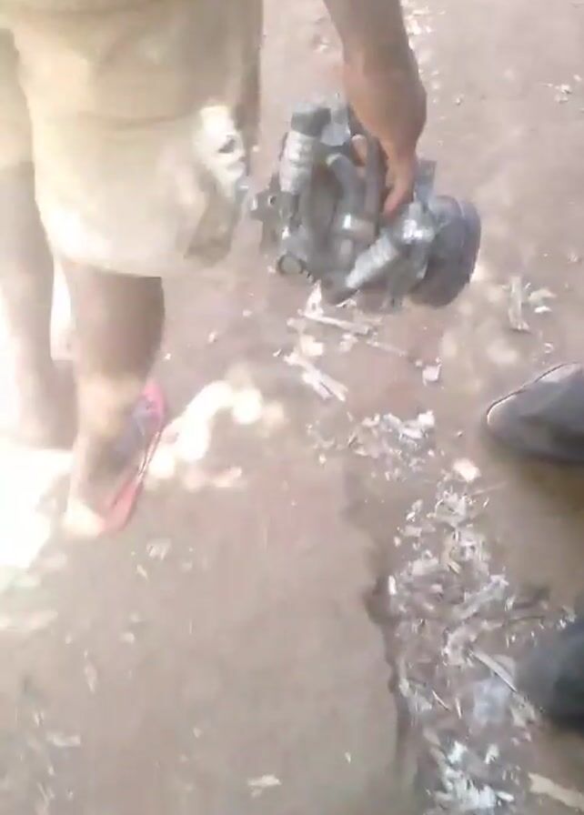 A person is holding a dirty, metallic object, possibly an auto part, in their right hand. They are wearing a striped shirt, light-colored shorts, and red flip-flops. The person is walking on a dirt surface strewn with debris, including white feathers and plastic wrappers. Part of another person in dark clothing is visible to the right. The lighting is bright, suggesting an outdoor setting.