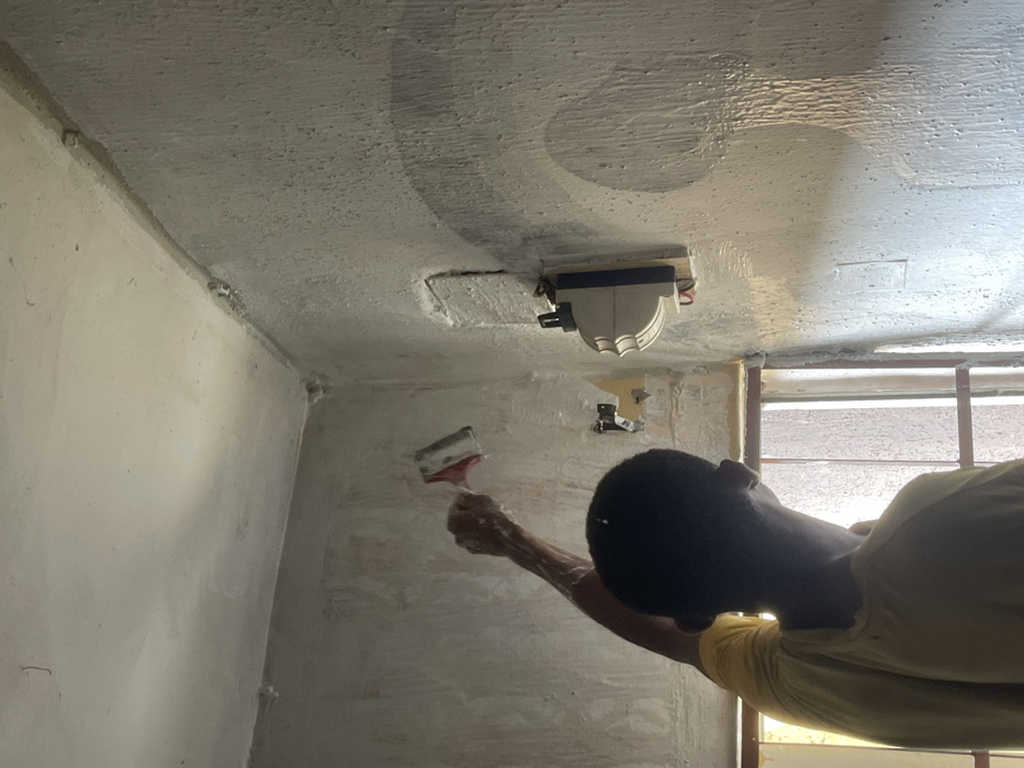 - "In an interior room in Uturu, Nigeria, a male individual, seen from behind and wearing a yellow short-sleeved shirt, is actively applying a white coating to the textured walls and ceiling" by FM-aUL5t2, licensed under CC BY 4.0