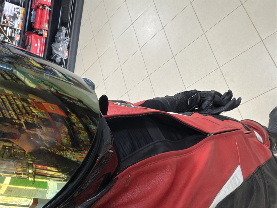 The image depicts an individual wearing motorcycle gear inside a retail establishment located in Cherven Bryag, Bulgaria