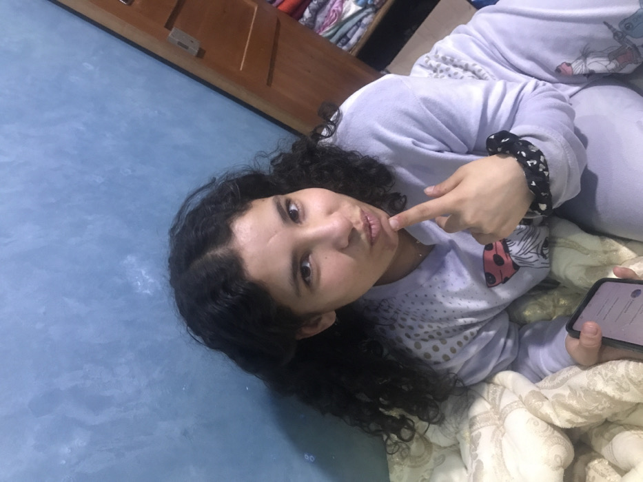 - "A young woman with curly dark hair reclines on a bed in light purple pajamas" by FM-E3A3g1, licensed under CC BY 4.0