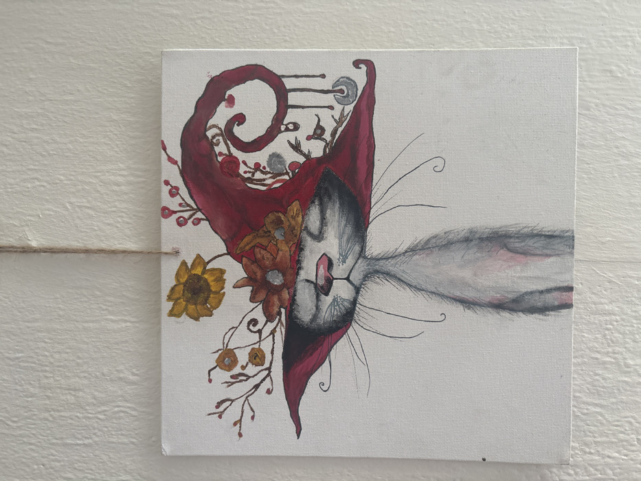 A square-format canvas painting hangs suspended by natural twine against a textured, light-colored wall. The painting depicts an anthropomorphized, slender, grey and white cat-like creature with closed eyes, a pink nose, and subtle whiskers. The creature wears an oversized, dark red, pointed hat adorned with a yellow sunflower, various autumnal flowers in shades of orange and brown, and bare branches with red berries. The hat's tip curls into a spiral, from which three dark, elongated shapes drip, one ending in a grey circular object. The painting's background is white. The specific city location of Rothem, Netherlands, cannot be determined from the visual information presented in this image, which solely shows an interior wall with the described artwork.