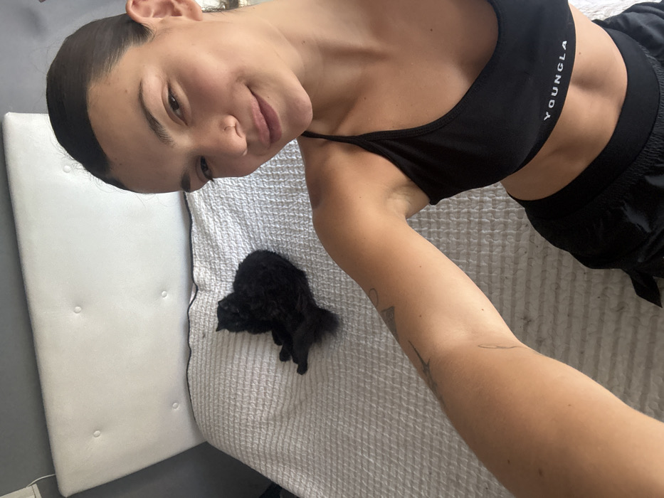 A woman wearing a black sports bra and shorts lies on a bed with a white headboard. She's positioned at an angle to the camera, displaying her torso and part of her face. Her dark hair is pulled back. Next to her on the bed lies a small, black, fluffy animal, possibly a puppy. The bed has a white quilted cover. The woman's arm is visible, showing faint tattoos. The room has a grey wall.