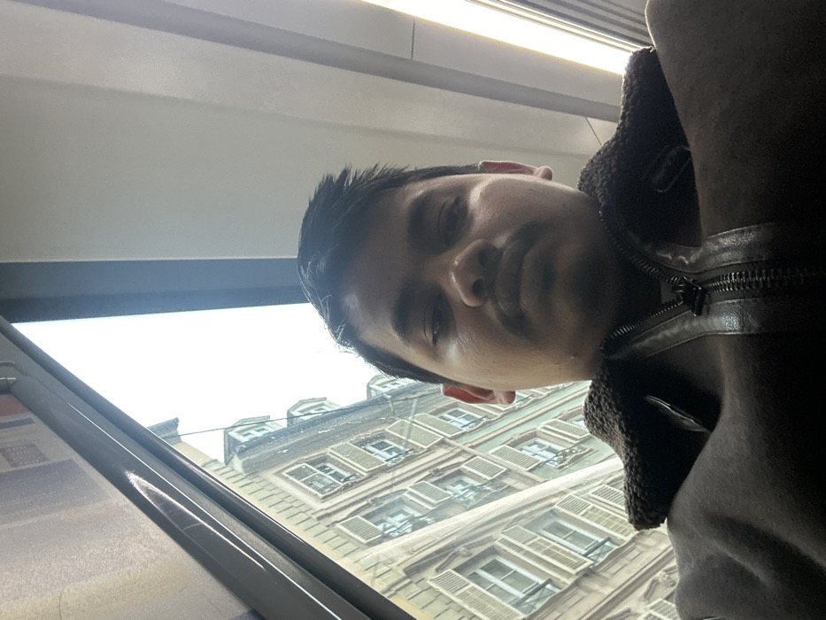 The image presents a low-angle selfie of a male individual, appearing to be in his late 20s to early 30s, with short dark hair, a mustache, and a neutral expression. He is wearing a dark brown zippered jacket with a prominent light brown fleece or shearling collar. The subject is situated within a vehicle, identifiable by the window frame and light-colored interior paneling on the right. Through the vehicle's window, a multi-story building with classic European architecture is visible. This building features multiple rows of windows, many equipped with light-colored, louvered shutters. The exterior environment suggests an urban setting in Strasbourg, France, consistent with the typical architectural styles found in the city's older districts. The sky appears bright and overcast. No specific street or landmark within Strasbourg is discernible to further pinpoint the exact location.
