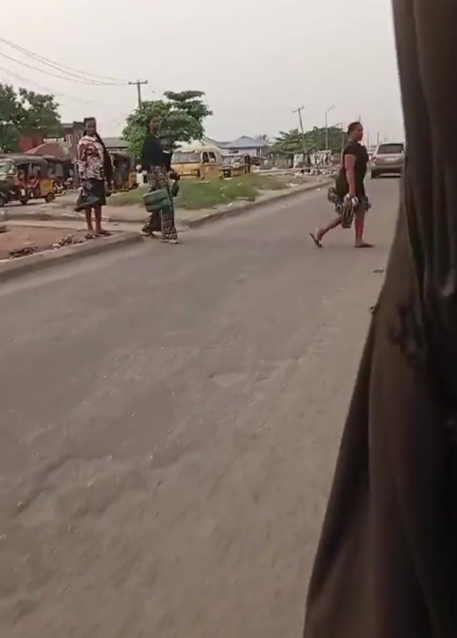 road in what appears to be a suburban or semi-urban area. There are a few pedestrians on the side of the road, and several cars and auto-rickshaws driving on the road. The sky is overcast, and the road itself is paved but appears to be in need of repair. The video appears to be taken from inside a moving vehicle.