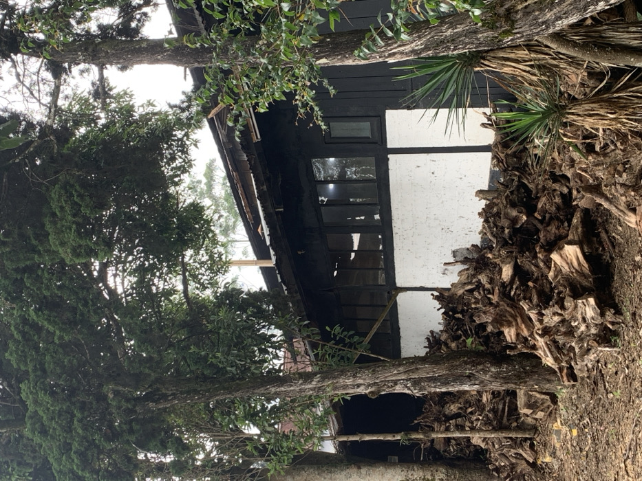 A photographic image captured in Ciherang, Indonesia, depicts an outdoor scene featuring a single-story structure partially obscured by vegetation. The building's upper section is dark, with multiple rectangular windows, some of which appear damaged or missing panes. Below, a white, solid lower wall section is present. The roof is corrugated metal, visibly damaged and decayed, with exposed support beams. A vertical, light-colored pole, possibly bamboo, extends above the roofline near the center-right. In the foreground, a large pile of tangled, dark brown wood roots and stumps is accumulated along the base of the building. Several mature trees with green foliage and dark trunks frame the structure, with one prominent tree on the left and another on the right. Smaller green plants, including what appears to be a yucca plant, are visible in the foreground near the right tree. The ground consists of earthy soil. No individuals are present in the scene.