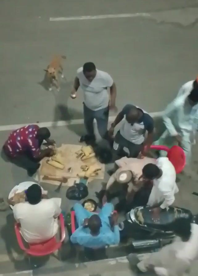 From a high-angle perspective, the video captures a group of approximately ten men gathered on a paved surface, possibly a parking lot. They are clustered around a spread of food items, including corn on the cob, placed on what appears to be a large cloth or mat on the ground. Most of the men are either seated on small red chairs or standing, engaging in eating and conversation. A motorcycle is parked nearby. A light-brown dog is also present, standing a short distance from the group and looking towards them. The men are dressed in a variety of casual clothing, including traditional attire. The lighting suggests it is either dusk or nighttime. The environment appears somewhat sparse, with minimal background details other than the paved surface and implied building structures.