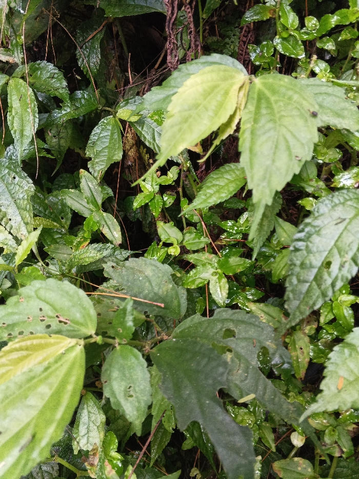 The scene depicts a dense, verdant natural environment within Desa Mburukulu, Indonesia. The foreground and midground are filled with a variety of green plant leaves and stems, exhibiting diverse shapes and textures. Several leaves display visible signs of predation, characterized by irregular holes and chewed edges. The foliage appears moist, indicative of recent precipitation or high humidity. Dark brown plant tendrils and intertwining stems are present throughout the dense growth. The background is largely indistinct, consisting of shadowed areas obscured by the layered vegetation. No human figures, animals, or man-made objects are present in the frame.