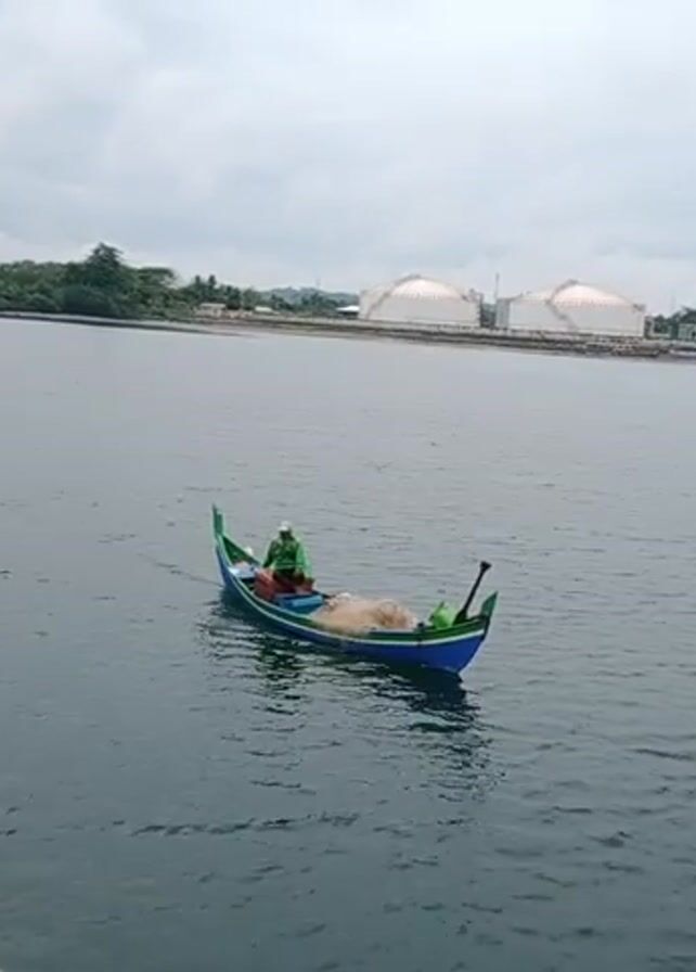 A single man in a small, blue and green boat with a distinctive prows cuts through the calm water. The boat, which appears to be a traditional fishing boat, contains nets and other gear. The man is wearing a white hat and a green jacket. In the background, across the expanse of water, are several large, white storage tanks and industrial buildings. A tree-lined shore is visible to the left. The sky is overcast, lending a muted, slightly gray tone to the scene. The camera is stable, offering a clear and steady view of the boat as it moves across the water.