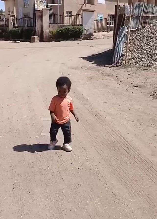 A young child, likely between 1 and 3 years old, is walking on a dirt road in what appears to be a residential area. The child has dark skin, dark curly hair, and is wearing an orange t-shirt, dark pants, and white sneakers. The child is walking towards the camera, taking small, deliberate steps. Behind the child are several buildings, some with wrought-iron fences and well-maintained landscaping. A pile of what appears to be roofing tiles or construction material is visible on the right side of the frame. The sky is clear and blue, suggesting a sunny day. A shadow cast by the child is visible on the ground in front of him. The speaker says, "That's my boy!" in the background.