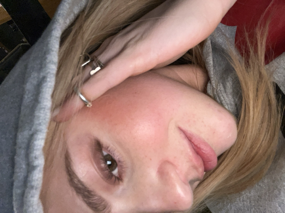 A close-up, slightly angled portrait of a fair-skinned person with light blonde hair. They are wearing a gray hooded sweatshirt. Their right hand, adorned with multiple rings, rests near their face. The person has light brown eyes and a subtle, natural-looking makeup. Freckles are visible on their cheek and nose. The overall lighting is soft and natural, highlighting the texture of their skin and hair.