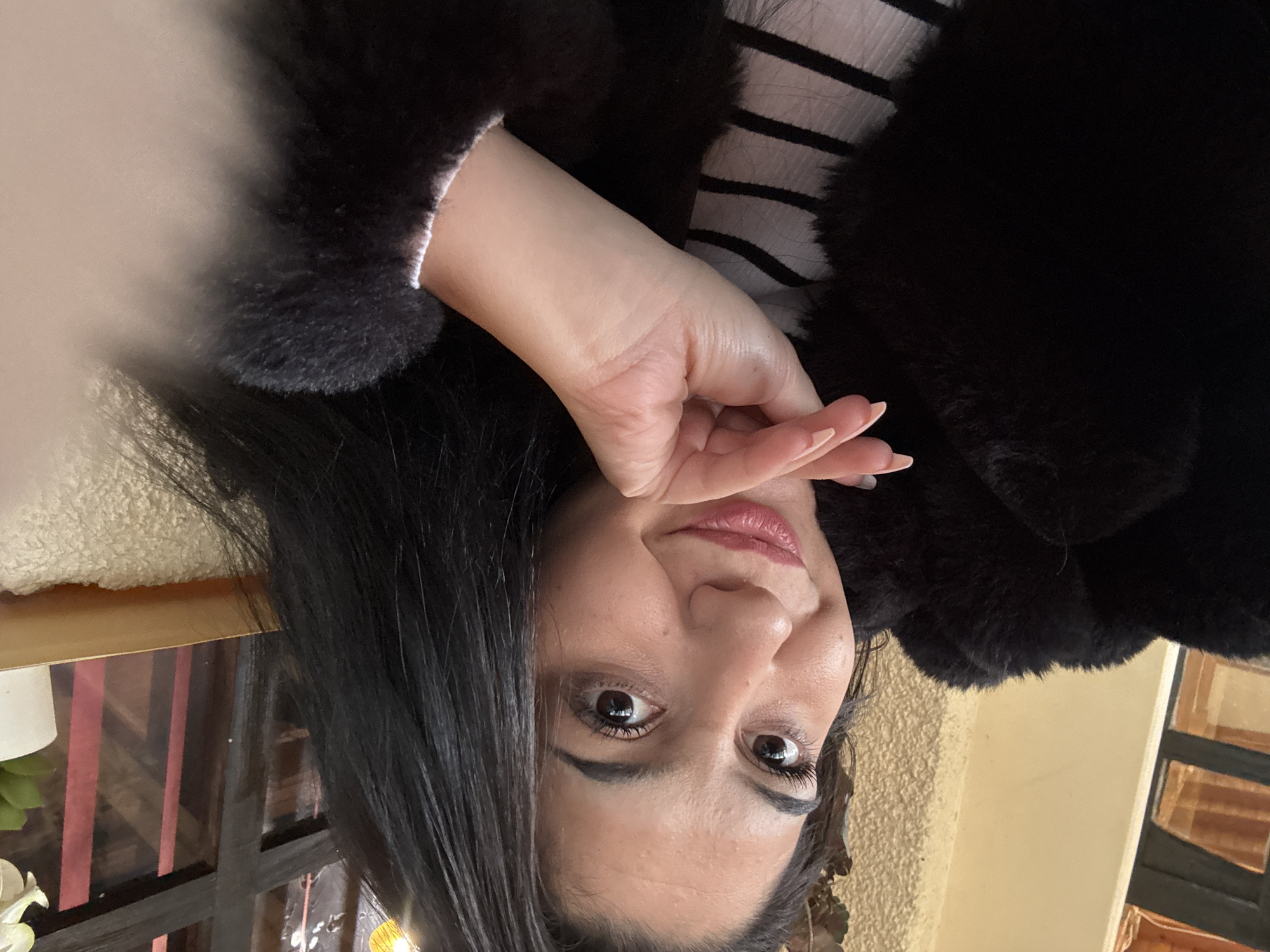 A female individual is depicted in an indoor setting in the city of Sadovo, Bulgaria. She has long, dark hair, dark eyes, and a light-to-medium complexion, featuring subtle makeup including pink lipstick and defined eyelashes. Her expression includes a slight smile, and she looks directly at the camera. She is wearing a black faux fur jacket, with a white and black horizontally striped garment visible underneath. Her left hand, featuring manicured pink almond-shaped nails, is positioned with fingers near her chin. The immediate background shows a textured beige wall. To the right, a dark-framed window with multiple panes is visible, behind which blurred warm light sources and faint reddish vertical elements can be discerned. A small white pot containing a green plant is situated on a narrow wooden shelf below the window, with a light-colored, possibly textured fabric, visible underneath the shelf.