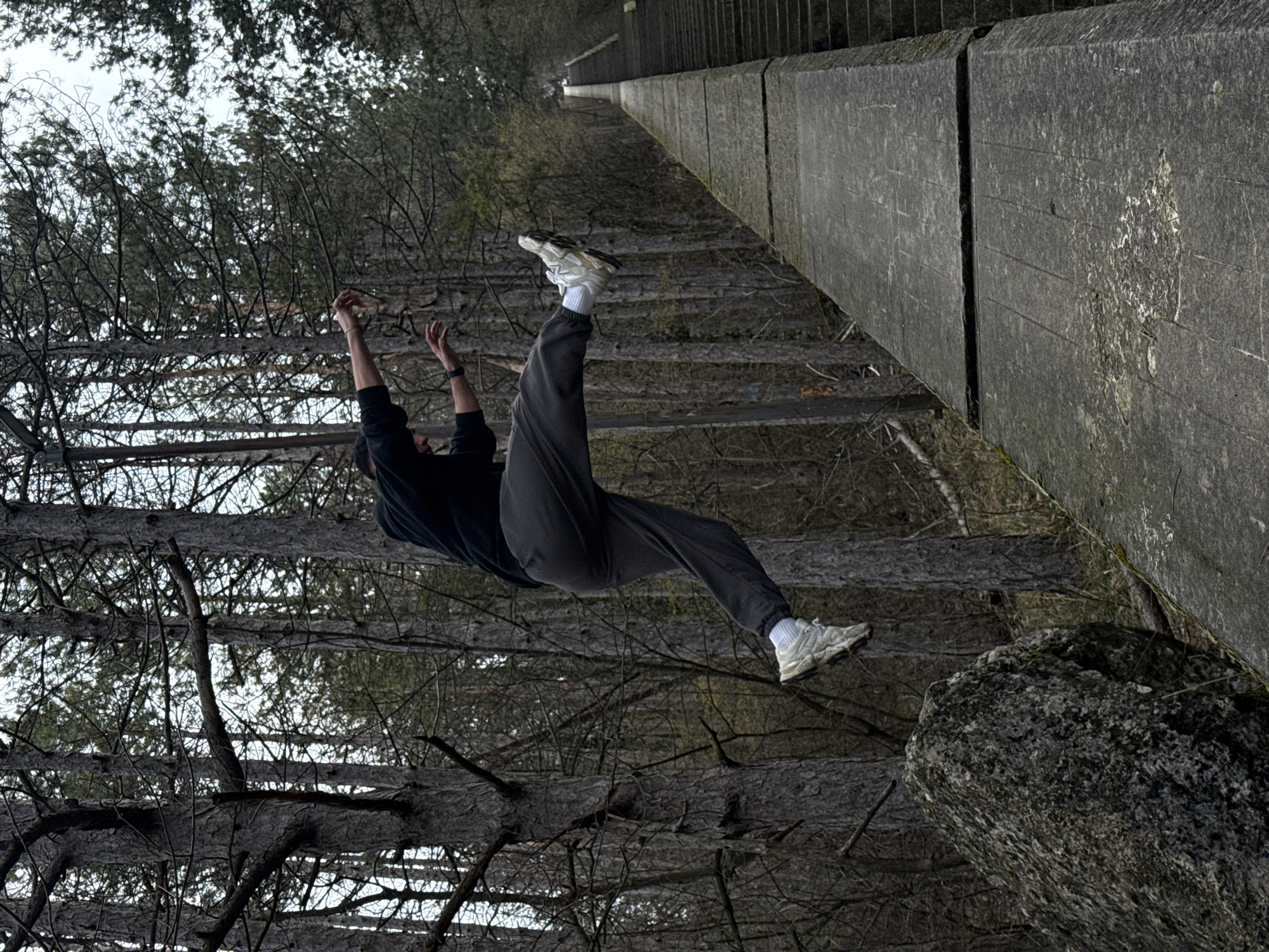 The scene depicts a single individual in mid-air, captured during a leap or jump, set within a dense pine forest on Shumen Plateau, Shumen, Bulgaria. The individual, dressed in a black long-sleeved top, dark grey sweatpants, white socks, and white sneakers, is positioned horizontally in the frame. Their arms are outstretched with hands open, the left leg is extended forward, and the right leg is bent. A watch is visible on the left wrist. The jump appears to originate from a large, mottled grey boulder positioned on the left side of the frame. To the right, a wide, angular concrete structure extends from the foreground into the background, culminating in a steep, ascending flight of concrete stairs that disappear into the upper right distance. The concrete surface shows weathering and minor damage. The entire background is filled with numerous tall, slender pine trees, many exhibiting bare branches among their foliage. The sky, visible through the canopy, is overcast and light grey.