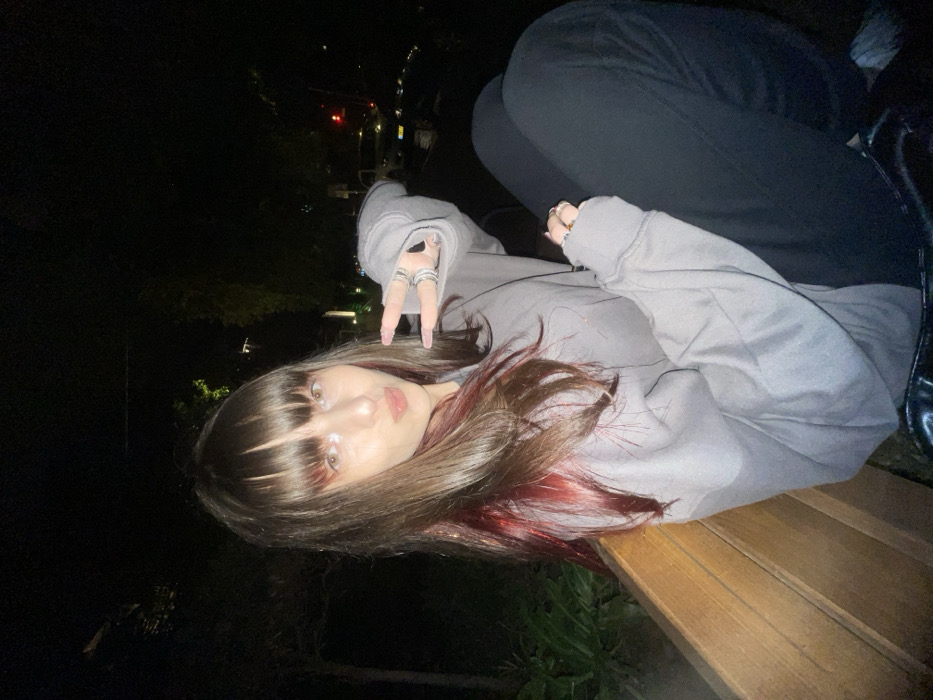 A young woman with brown hair and red streaks lies on a wooden bench. She is wearing a gray hoodie and black pants, with black shoes visible. She poses with a peace sign. The background is dark, suggesting it's nighttime, with faint lights in the distance. The image is slightly blurry and the perspective is tilted. The overall mood is casual and somewhat edgy.