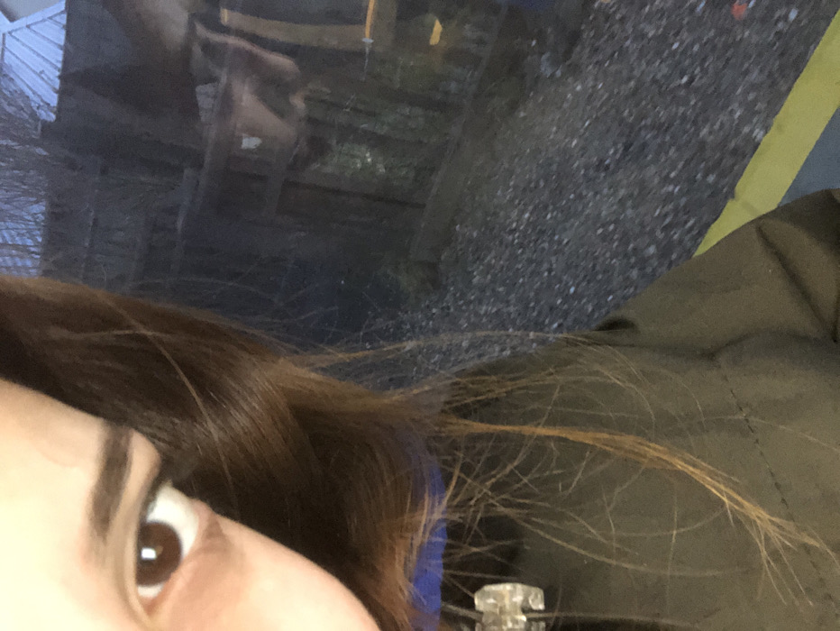 A partial view of a person's face with brown hair, eye, and eyebrow is visible. A blurry background reveals a reflective surface showing a distorted image of a building-like structure. Adjacent to the hair is a section of a garment, perhaps a jacket, olive-green in color. A yellow line is also discernable, possibly indicating a painted marker on the ground. The image is slightly rotated.