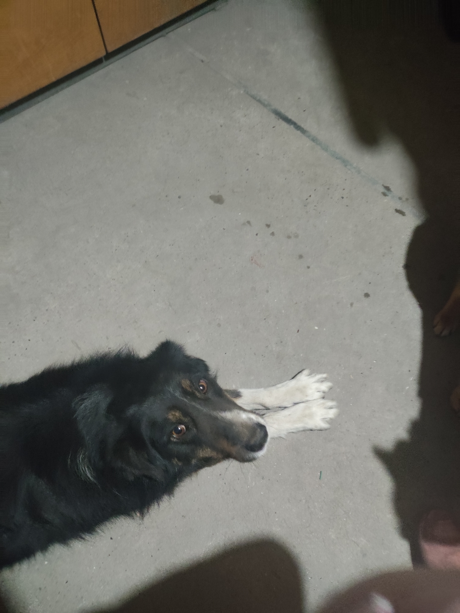 A black and white dog is lying on a grey concrete floor. The dog is positioned in the lower left corner of the image, looking up with brown eyes. The dog's front paws are extended in front of it. A shadow is cast on the right side of the image. The image contains a section of brown cabinets in the upper left corner. The location of the image cannot be determined to be Yerzhovo, Moldova.