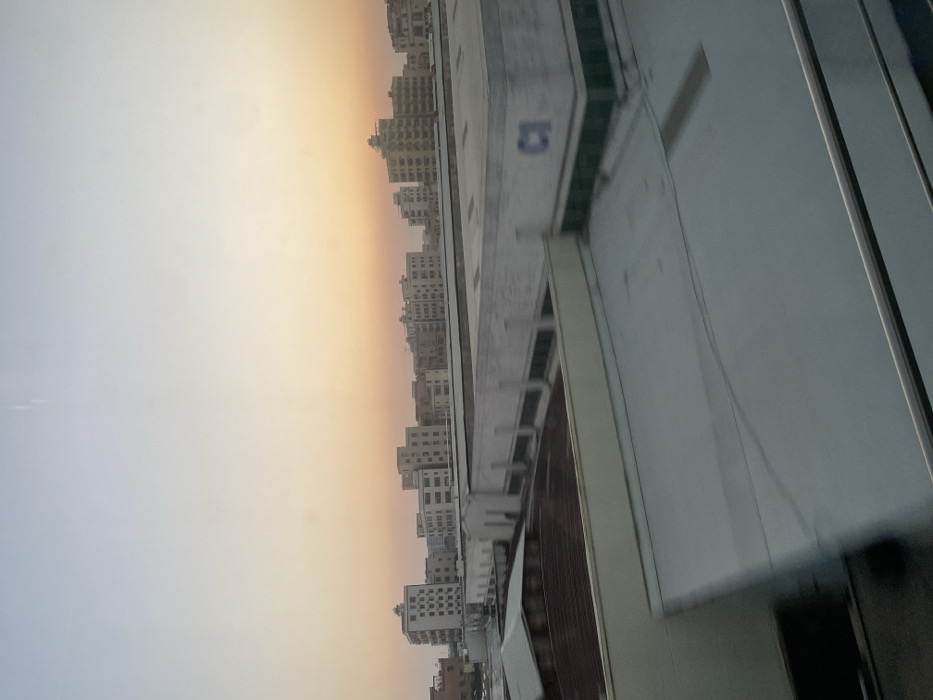 The image depicts an elevated view of an urban-industrial landscape in Zhongshan, China, at either sunrise or sunset. The sky displays a gradient of light blue at the zenith transitioning to a soft orange and peach hue near the horizon. In the immediate foreground, a metallic handrail or window frame is visible across the bottom right, with a blurred, reflective dark surface beneath it. Above the railing, multiple flat, light grey roofs of industrial buildings or warehouses extend across the midground. One prominent white building in the midground features a dark green band along its lower facade and the identifier "C1" marked on its upper wall. Other roofs exhibit varying textures and colors, including a darker, possibly reddish-brown, domed or corrugated structure to the left. In the background, a dense cluster of multi-story residential or commercial buildings, predominantly light-colored (white, beige), forms the skyline against the colored sky. No individuals, explicit actions, or interactions are visible within the frame. The overall scene exhibits slight motion blur, suggesting the image was captured from a moving vantage point.