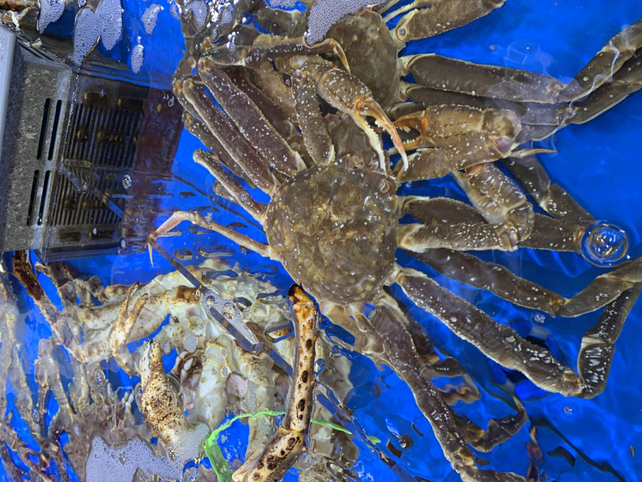 Several crabs are submerged in a blue-tinted tank of water, some partially obscured by the water's surface