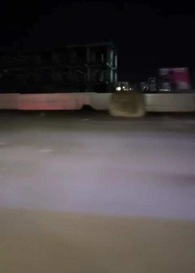 The video is taken from a moving vehicle at night. The camera is focused on the road ahead. On the right side of the road, there is a long, low wall or barrier. Beyond the barrier, there are blurry structures including what appear to be unfinished buildings and a trailer. Street lights illuminate the area in the distance. A post with yellow and black stripes passes by. The road is paved and appears relatively smooth. The overall impression is of a desolate or industrial area.