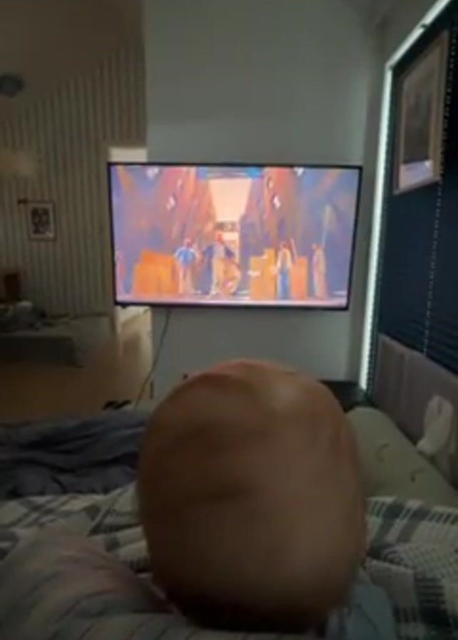 baby lying on a bed watching television. The baby has light-colored hair and is facing away from the camera. The television is showing a colorful cartoon scene with characters standing on a street. The room has striped wallpaper and blinds on the window. There is also another bed in the background.