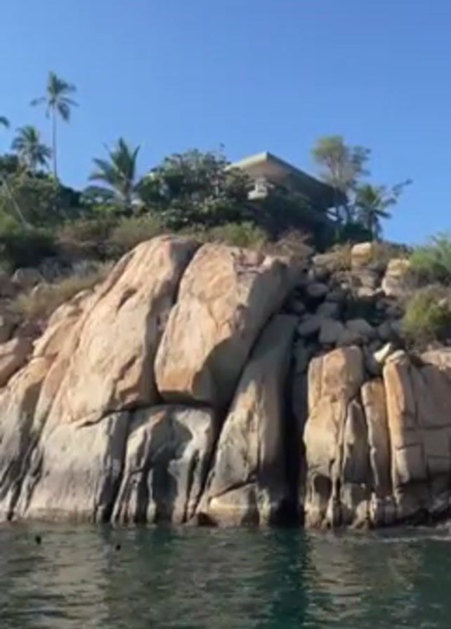 The scene features a rocky coastline with a modern house perched atop a cliff overlooking the water. The house has a flat roof and is surrounded by trees, including palm trees. The rocks are large and beige with dark crevices. The water is a dark greenish-blue with some ripples. There are a few people swimming in the water near the rocks, and the sky is clear and bright blue. The camera is positioned on the water, looking up at the rocks and the house. The shot is static with no camera movement.
