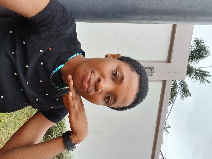 female individual outdoors in Ikeja, Nigeria. She possesses dark skin and short, dark, closely cropped hair, directly facing the camera with her lips slightly pursed. She is attired in a black short-sleeved t-shirt adorned with scattered multicolored rhinestones, and a visible blue and green metallic-appearing necklace. A small dark stud earring is present in her left ear, and a dark-strapped wristwatch is on her left wrist. Her left hand is positioned under her chin, with fingers slightly curled. To the far left, a dark grey vertical cylindrical pole is partially visible. The background consists of a light-colored wall featuring a light brown coping, with a wall-mounted light fixture visible to the right of the subject's head. Above the wall, green palm fronds are discernible against an overcast sky. Green ground vegetation is visible in the lower right quadrant of the scene.