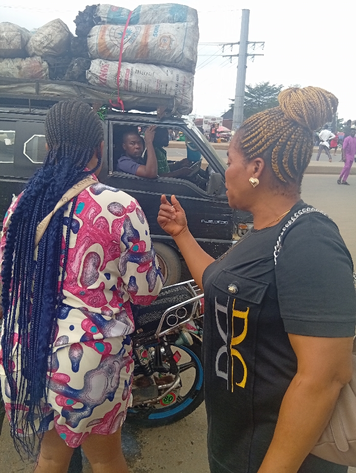 This image depicts a daytime street scene in Ura Nta Umuarandu, Nigeria. In the foreground, two women of brown complexion stand facing each other near a dark-colored van. The woman on the left has long, dark blue box braids and wears a multi-colored dress with an abstract pattern in pink, white, blue, and purple. The woman on the right, in profile to the camera, has light blonde box braids styled into a large top knot. She wears a dark short-sleeved shirt with a gold and silver "DG" logo on the left chest, a gold chain, and a heart-shaped gold earring. Her right hand is raised, making a gesture. Behind the women, a dark-colored van or small bus is either stopped or parked. Its roof is heavily laden with numerous large, light-colored sacks, some marked "50KG" and "PRODUCT OF NIGERIA," secured with a red strap. A man wearing a dark blue polo shirt is visible in the driver's seat, looking out the open window towards the left. A second individual is partially visible in the passenger seat. Partially visible between the women and the van is a motorcycle with blue and black spokes on its rear wheel and chrome exhaust pipes. The background shows utility poles and power lines against an overcast sky. Distant figures, including one person in a purple outfit, are walking on the street, and faint structures suggest a commercial or residential area. The ground surface appears to be paved.