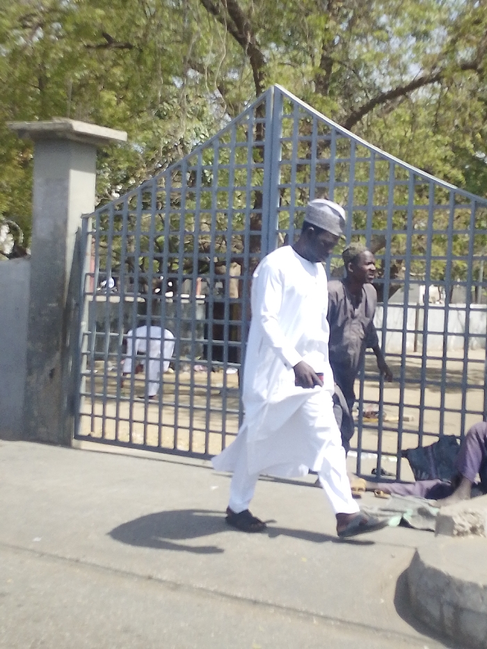 The image captures a daylight street scene in Tarauni, Nigeria. In the foreground, an asphalt pavement extends across the lower portion of the frame. A male subject, dressed in a white long-sleeved tunic, white trousers, black shoes, and a light-colored cap, walks from right to left across this pavement. He carries a dark object in his left hand, visible at hip level. A distinct shadow is cast on the pavement to his left. In the lower right corner, a concrete curb is visible, with a fragment of a person's leg in dark clothing and a dark fabric object resting on the ground. A large, grey metal grid gate forms the midground, appearing to delineate an entrance or boundary. Behind this gate, towards the right of the frame, another male subject in dark clothing is visible, facing generally forward. Further left and behind the gate, a third subject, clothed in white, is observed in a bent-over posture. Green foliage and tree branches are visible through and above the gate, forming the background, indicating a vegetated area. A light-colored concrete pillar is partially visible on the far left edge of the frame.