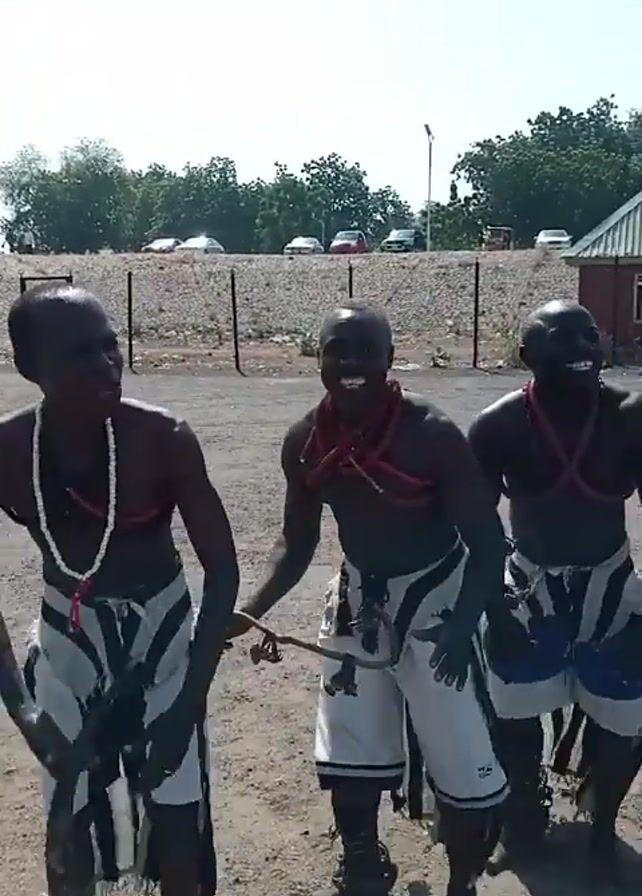 group of six dark-skinned men performing a dance. All the men are shirtless and wear beads around their necks and ankles. They are wearing black and white striped fabric wrapped around their waists like skirts. Some of the men are holding short wooden sticks or tools with metal on the end. They stand in a line facing the camera, moving, laughing, and appearing to sing. The background includes a dirt field, low concrete walls, fencing, and a small building. Cars are visible in the distance, as well as trees and light poles. Other people are standing by, watching the performance. The lighting is bright and the overall tone of the video is celebratory.