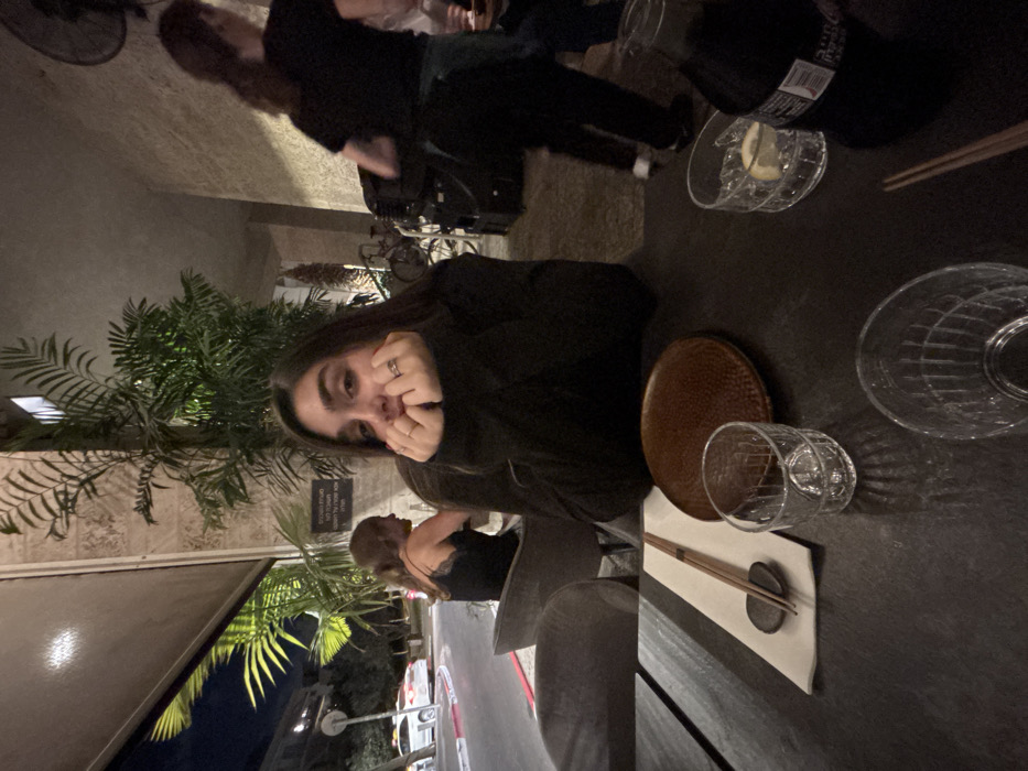 The image captures a nighttime scene at an outdoor dining area of the "בית תאילנדי" (Thai House) restaurant, located at Bograshov Street 8 in Tel Aviv, Israel. The central subject is a young woman with long dark hair, wearing a dark long-sleeved garment, seated at a dark table and looking directly at the camera. Her hands are clasped below her chin, and she wears a ring on her left ring finger. On the table in front of her are a white paper napkin, wooden chopsticks resting on a dark chopstick holder, a round, textured reddish-brown plate, and three clear ridged glasses; one contains ice and a lemon slice, while the others are empty. A dark beverage bottle with a partial Hebrew label is visible on the far right. In the background to the left, through an open-air section, a street is visible with a white car and a taxi, alongside a curb marked with red and white paint, typical of Israeli no-parking zones. Another woman with lighter hair, wearing a dark top, is seated at a table further back, facing the street. Lush green palm-like foliage is prominently featured against the building's light-colored, textured facade. To the right, a restaurant staff member in a dark t-shirt and apron is partially visible, moving away from the camera. The area is illuminated by artificial lighting from both the restaurant and the street.