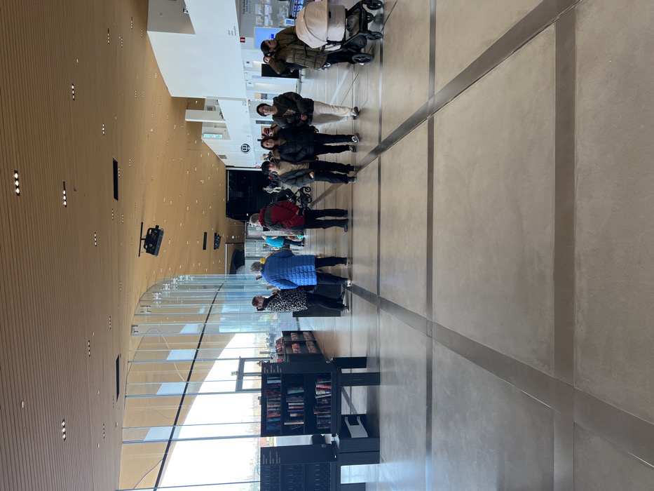 The image captures the ground floor interior of the Oodi Central Library in Helsinki, Finland. The spacious environment features a high ceiling with light wooden slats and integrated lighting, a polished light grey concrete floor with dark metallic grid lines, and a prominent curving glass wall on the left extending from floor to ceiling, revealing an exterior view. Black, multi-tiered book display shelves filled with books are positioned along the left side. Approximately 10-15 individuals are visible within the scene. In the left-midground, three adults are standing and interacting; one wears a black and white patterned jacket, another a blue puffer jacket. Centrally in the mid-ground, three young adults are walking towards the viewer, two wearing dark puffer jackets, and one a lighter jacket with light trousers. To the right, an adult in a dark puffer coat pushes a light-colored baby stroller containing an infant. Other individuals are scattered further back, some walking and some standing. Two black, box-like structures, possibly light fixtures or speakers, are suspended from the wooden ceiling. White walls with informational signage are visible on the right side of the frame.