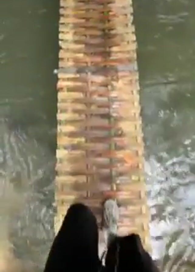 first-person perspective of someone walking across a narrow, woven-wood bridge over a river