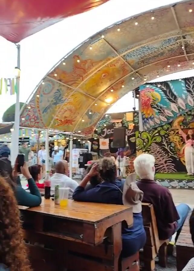 n outdoor performance area with a young woman singing on a small stage, backed by a band and colorful artwork. Several people are seated at wooden tables, watching the performance. Some are looking at their phones, while others are listening. The area is covered by a canopy decorated with colorful fabric and string lights. The atmosphere seems relaxed and casual, suggesting a market or festival setting.