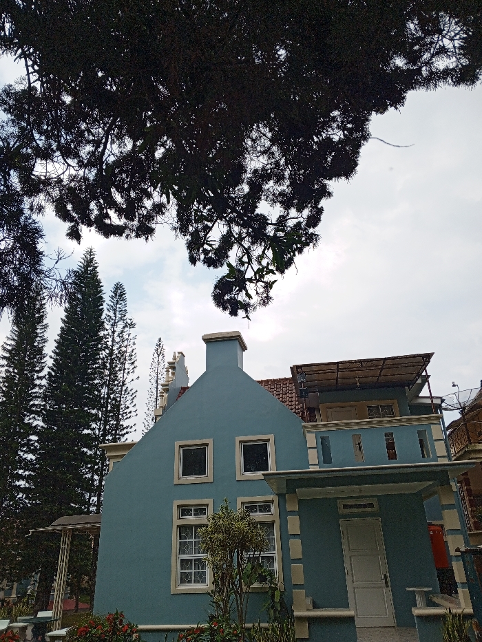 A daytime exterior scene captures a two-story house with a prominent teal facade and light beige trim. The left section features a stepped gable with a chimney and two square windows above two larger rectangular windows with white frames and decorative grilles. The right section includes a ground-floor entrance with a white door under a small covered porch, adjacent to a small white bench. An upper-level balcony with a teal railing is covered by a flat, possibly metal, canopy. A satellite dish is partially visible on the far right of the structure. The roof behind the gable appears to be tiled with reddish-brown material. Landscaping at the base of the house consists of green foliage and red flowering plants. The upper portion of the image is dominated by the dense, dark foliage of a large tree silhouetted against an overcast sky with patches of brighter white. Several tall, slender conifer-like trees rise in the background to the left of the house. No individuals are present, and no actions or interactions are depicted. There are no visual markers within the image to identify the location as Weintiapa, Liberia.