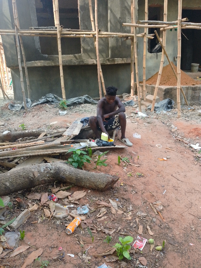 An outdoor scene depicts a male individual sitting on a makeshift wooden platform in a construction or undeveloped area within the city of Unknown, Unknown. The individual, appearing young, is topless and wears patterned shorts with light-colored slides. He is observed looking downward, with his hands positioned over a small yellow object, possibly a container, situated near his lap. A black plastic bag rests beside him. The ground is reddish-brown earth, littered with construction debris including wood planks, a large tree trunk, plastic waste, discarded beverage cans, and natural foliage. In the background, a two-story concrete building under construction is visible, supported by a scaffold structure made of bamboo poles. A mound of light brown sand or dirt is present near the building's base on the right side of the frame.