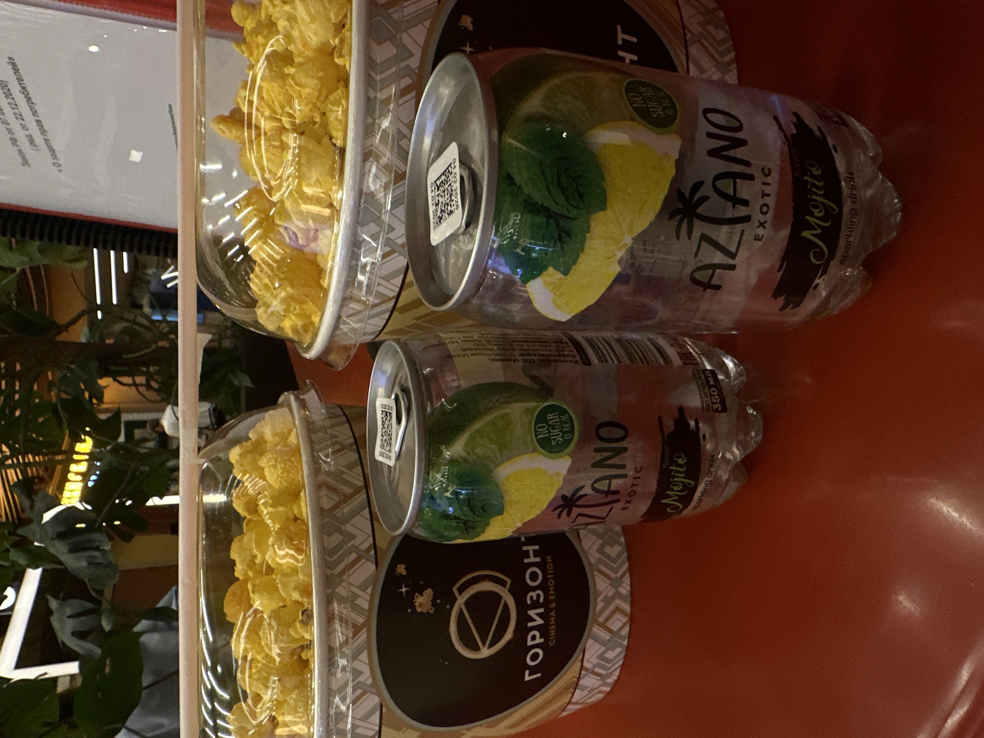 tabletop with two containers of popcorn and two cans of Aziano Exotic Mojito sparkling drink. The popcorn containers have a "ГОРИЗОНТ CINEMA & EMOTION" logo on the side. The cans of Aziano Mojito have a "NO SUGAR O KCAL" label. The image includes a partially visible sign on the left, stating "Закон РФ от 07", suggesting it may be related to consumer protection rights in Russia. The sign is partly in Russian, and the text includes the date 22.12.2020. The text on the Mojito can specifies that it is produced by "ООО «Амано»" in Moscow, Russia, and the can contains 350 ml. The location appears to be at a cinema due to the popcorn containers branding. The city and region information, "Россия, Москва", refers to Moscow, Russia. While the image specifies Moscow as the production location of the Mojito drink, it does not indicate the location of the image being taken is in Rostov-on-Don.