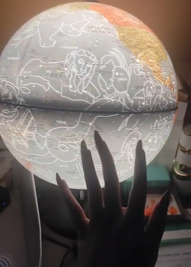 lit globe with constellation outlines on its surface, with a hand resting near it. The globe has landmasses colored in orange and the constellation outlines are white. A dark hand with long, pointed nails is positioned near the globe. A watch is visible on the wrist of the hand. The globe appears to be on a desk, which also holds items such as a tray, a pen, and some papers. The lighting in the room is warm, creating a glow around the globe. The globe is rotating, moving the constellation outlines around its axis.