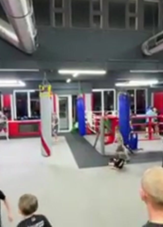 wide shot inside a gym that appears to be for martial arts