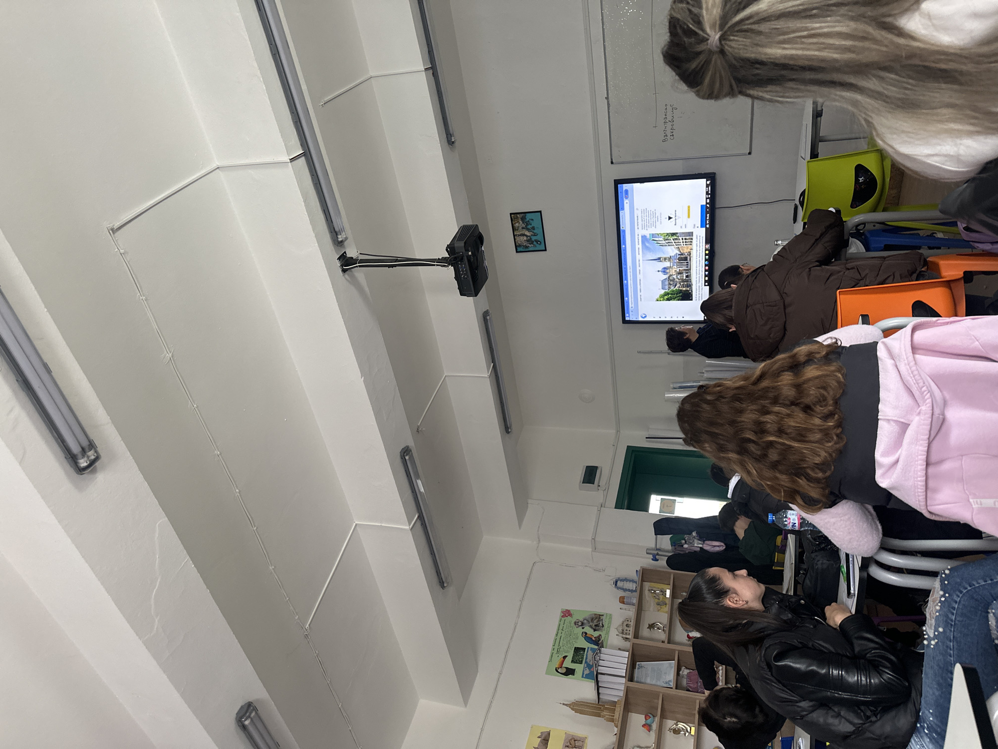 The image depicts an indoor classroom environment in Panagyurishte, Bulgaria. The room has white walls and a white ceiling with visible concrete beams and surface-mounted electrical conduits. Multiple linear fluorescent light fixtures are present on the ceiling. A black multimedia projector is mounted centrally from the ceiling. Seven individuals, primarily young adults or teenagers, are visible within the frame, seated at individual desks facing the front of the classroom. * In the immediate foreground, the back of a person's head with long, light brown hair styled in a bun is visible. * To the left, a person with long dark hair, wearing a black puffer jacket and blue jeans with white embellishments, is seated at a desk, looking towards the front. * Adjacent to this individual, another student with long brown wavy hair, wearing a pink hooded top, is seated. * Further into the room, another student in a dark brown puffer jacket is seated at a desk, next to an orange-backed chair. * Towards the front right, an adult female, likely an instructor, stands near a large wall-mounted flat-screen monitor, facing the students. She is wearing dark clothing. Other students are partially obscured or visible in the background. The front of the classroom features a large flat-screen monitor displaying a webpage with an image of a large Gothic-style building, possibly a cathedral, and accompanying text in Bulgarian. To the right of the monitor, a white whiteboard displays handwritten text in Bulgarian, which appears to include "Влиътрезиско скъровище" (possibly a misrendering of "Вътрешно съкровище" meaning "Internal treasure" or similar). Above the monitor, a small framed picture depicting a landscape or marine scene is mounted. On the left side of the room, a wooden shelving unit holds various objects, including books, small models resembling the Empire State Building and other landmarks, trophies, and bottles. Posters, one illustrating various animals (camel, toucan, parrot, monkey) and a world map, are affixed to the wall above the shelving. A green-painted door is visible on the left wall. Desks hold notebooks, pens, and personal items such as a blue "Devin" brand water bottle and a mobile phone with a green case. The scene indicates an educational lesson or presentation is in progress.