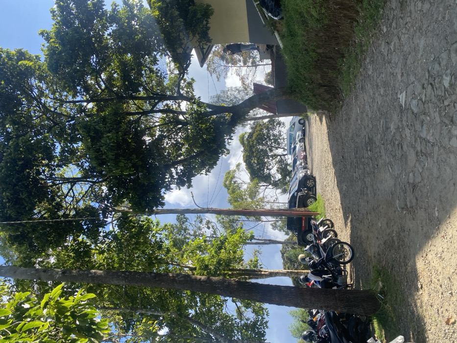 The scene is a parking lot in the Kecamatan Tawangmangu area of Indonesia, located at coordinates -7.661 latitude and 111.185 longitude. Several motorcycles are parked near a dirt path. Behind the motorcycles, a line of parked cars and vans extend to the right, leading towards a building at the end of the path. There is a person standing near the building. The environment features a dense, green canopy of trees. Sunlight is filtering through the trees and illuminating the ground. The dirt path has loose stones and appears to be a walkway leading to the building.
