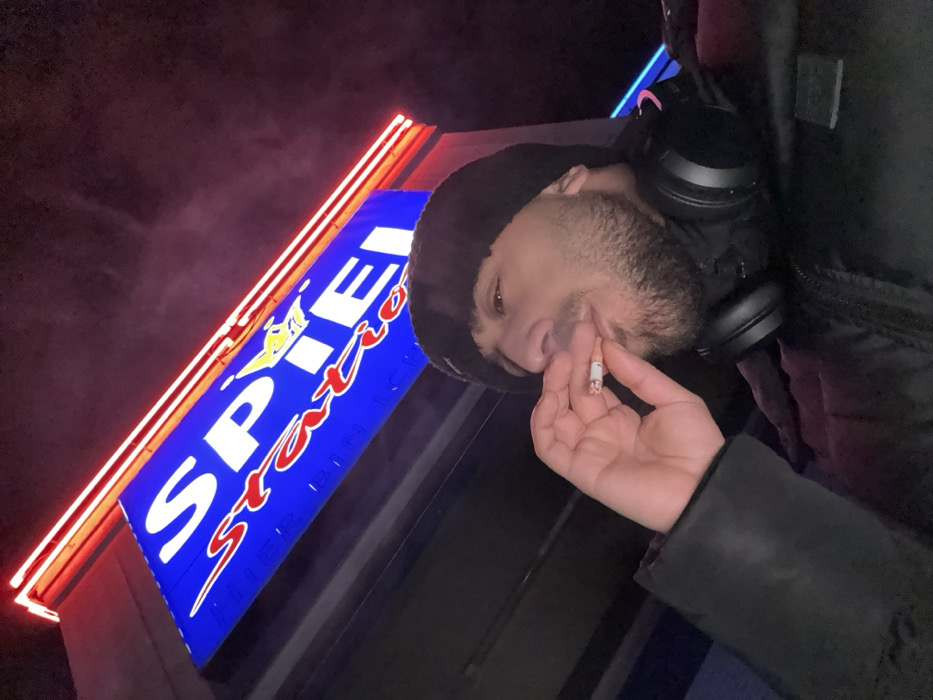 A man with a beard, wearing a black beanie and jacket, holds a cigarette to his lips. Headphones are around his neck. A blue and red illuminated sign reads "SPIEL Station." The background is dark, suggesting it is nighttime. The image is taken at an angle.