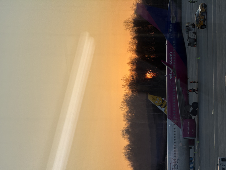 - "The image depicts an airport tarmac scene at sunset or sunrise, viewed through a window with interior light reflections" by FM-CEkUG3, licensed under CC BY 4.0