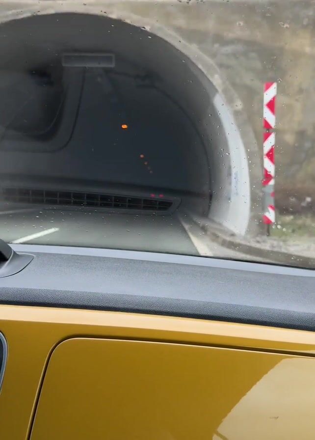 From the vantage point of inside a car, the video shows the vehicle entering a tunnel