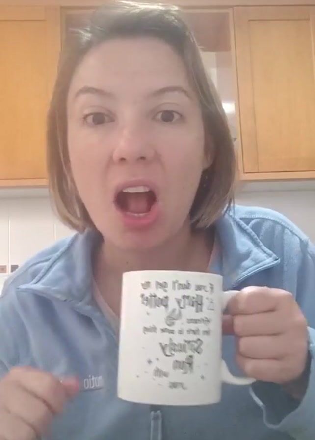 A woman with short, light brown hair and fair skin is sitting at a table with a woven placemat in front of wooden cabinets. She wears a light blue fleece jacket. The woman is holding a white mug with text on it, which she turns to face the camera. She says something to the camera and then takes a drink from the mug.