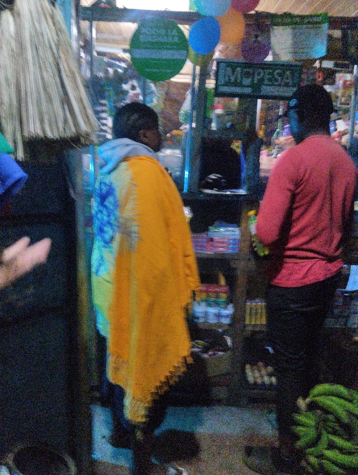Two people stand in front of a small store, illuminated by dim light. One person, draped in a yellow cloth with black edges, faces the store's window. The other, wearing a red shirt and black pants, stands to the right, his back to the camera. Shelves are stocked with goods. Green, blue, and orange balloons hang above. A sign labeled "MPESA" is visible. Bunches of green bananas are piled on the ground near the right side.