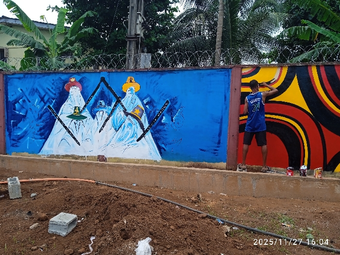 This image captures an outdoor scene in Agege, Nigeria, on November 27, 2025, at approximately 16:04. A concrete perimeter wall serves as a canvas for a mural project. The wall's left section, approximately two-thirds of its visible length, features a mural against a dark blue background. This mural depicts three stylized, robed figures in white and light blue, each wearing distinct hats. The left figure wears a red-rimmed pointed hat over a green-brimmed hat with gold insignia. The central figure is smaller, wearing a blue-brimmed hat. The right figure wears a yellow-rimmed pointed hat over a yellow-brimmed hat with gold insignia. Two large black geometric 'A'-frame structures overlay these figures. The right section of the wall features a vibrant, unfinished mural displaying a geometric abstract pattern with concentric and overlapping shapes in yellow, red, and black on a white background. A male individual is actively painting the yellow section of this right mural. He is positioned with his back to the viewer, standing on a narrow concrete ledge at the base of the wall. He wears a blue sleeveless jersey with "BASKETBALL" and the number "21" on the back, black shorts, and dark sandals. He holds a paintbrush in his right hand, extended towards the wall. Several paint cans in red, white, black, and yellow are visible on the ledge near his feet. Above the wall, barbed wire fencing is visible along its entire length. Dense green foliage, including banana plants and palm trees, forms the background. A section of a light-colored building with a roof is visible through the foliage on the far left, and a utility pole with dark components stands centrally in the background. The sky is overcast. The foreground consists of disturbed reddish-brown soil with sparse green sprouts. Two hollow grey concrete blocks, an orange pipe, a black hose or cable, and white plastic debris are scattered across the ground.