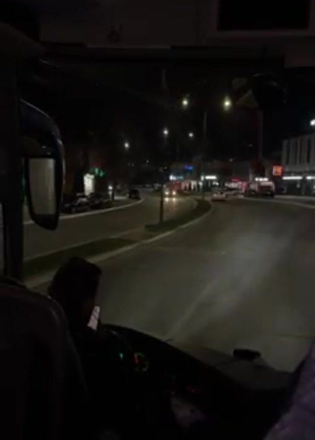 A point-of-view shot from inside the front cabin of a bus shows the driver holding a smartphone while driving through a city street at night