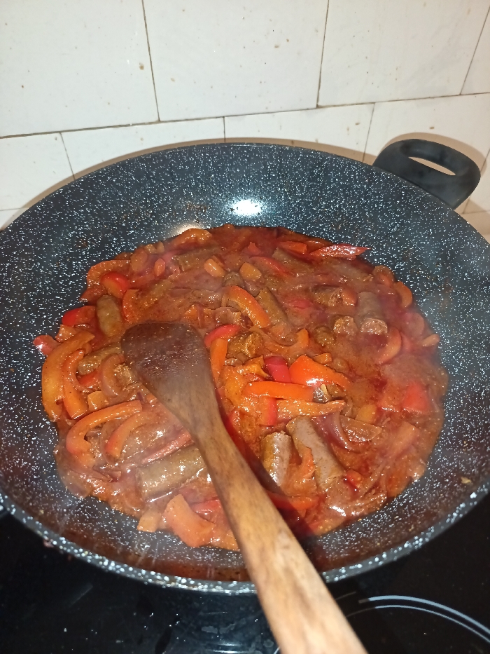 A close-up shot displays a cooking pan filled with steaming sausage and peppers. The peppers, predominantly red, are sliced into thick strips and mixed with sausages that appear browned. A rich, reddish-brown sauce coats the ingredients. A wooden spoon rests in the center of the pan, partially submerged in the mixture. The pan itself is dark gray with a speckled pattern. The background shows a tiled wall.