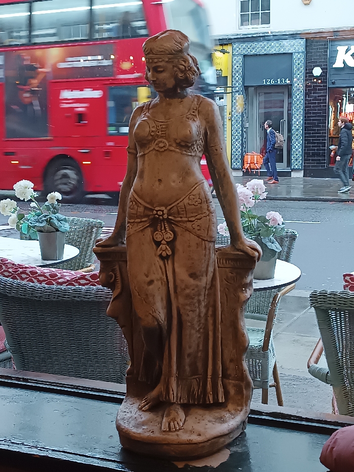 The image displays a street scene in London, United Kingdom, viewed from an indoor vantage point, likely a shop or restaurant window. In the immediate foreground, a weathered, light brown statue of a female figure stands on a dark, reflective surface. The statue depicts a woman in a stylized costume, including a bandeau top, a patterned belt with a central ornament, a long skirt with fringe, and a headpiece, with her hands resting on two flanking pedestals. Through the window, an outdoor dining area is visible with wicker chairs and small tables. One table to the left holds a grey pot with white artificial flowers, while another to the right holds a grey pot with pink artificial flowers. Beyond this, a wet asphalt street is visible, indicating recent rain. A red 'Metroline' double-decker bus is in motion, blurred, moving from left to right. Across the street, a sidewalk features pedestrians and commercial buildings. One building, located at "126-134," displays a dark tiled facade with light blue square patterns. Adjacent to it, another building has a black facade with a partial 'K' sign. Two male pedestrians are present on the sidewalk: one in a dark suit with a backpack, walking left near an orange delivery bag, and another in a dark jacket, walking right further down the street. The overall lighting suggests an overcast day.