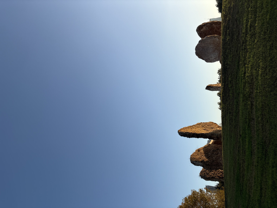 The image displays an outdoor scene at the "Seven Mills" (Shivat HaTachanot) archaeological site within Yarkon Park (Ganei Yehoshua) in Tel Aviv, Israel. The foreground consists of a grassy green mound, with the lower portion in shadow and the upper part receiving direct sunlight. On the crest of this mound, seven large, irregular ancient stone structures are visible. These appear to be remnants of historical architecture, likely the Roman aqueduct. From left to right, a cluster of three to four elongated and irregular stone masses, some partially covered in dark vegetation, are illuminated by low-angle warm sunlight from the right. To their right, a solitary, tall, narrow stone stands distinctly apart. Further right, a pair of large, rounded, smooth-faced stones are brightly lit on their left sides by the same warm sunlight. In the background, beyond the stone structures, additional trees and foliage are visible. On the far left, a deciduous tree with green leaves is present, with distant modern high-rise buildings faintly discernible behind it. On the far right, a tall, light-colored modern building (possibly a skyscraper) rises above the tree line, reflecting the sunlight. The upper two-thirds of the image are dominated by a clear, unclouded blue sky, transitioning to a lighter hue towards the right horizon, indicating either late afternoon or early morning. No individuals or animate subjects are present in the frame.